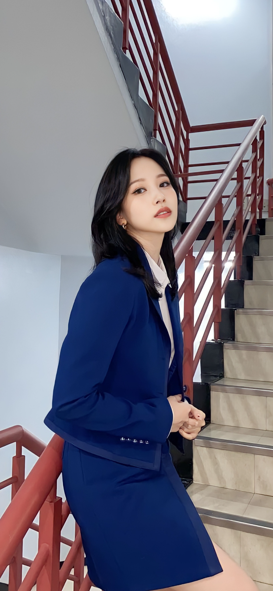 촬영 장소는 단순한 계단이지만, 미나는 그 공간을 마치 화보 속 한 장면처럼 바꿔놓았습니다. 앉아 있는 모습에서는 차분함과 고혹적인 분위기를 동시에 느낄 수 있고, 서 있는 모습에서는 자신감 넘치는 카리스마가 돋보입니다.