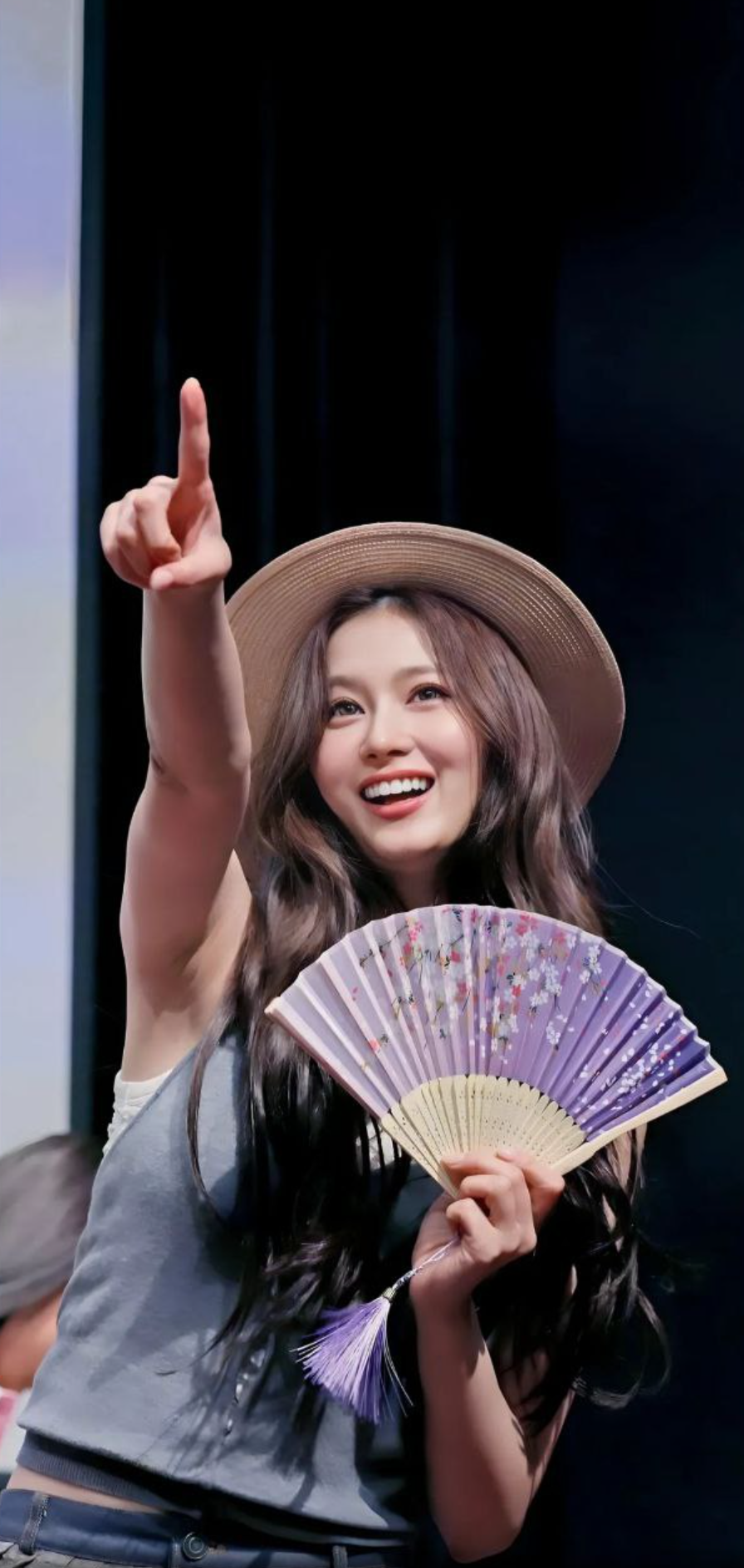 두 번째 사진에서는 팬들과 함께하는 자리에서 활짝 웃는 사나의 모습을 볼 수 있습니다. 모자와 부채를 활용한 스타일은 발랄하면서도 개성 있는 매력을 보여주고 있으며, 팬들에게 즐거움을 주는 그녀의 따뜻한 에너지가 잘 느껴집니다.