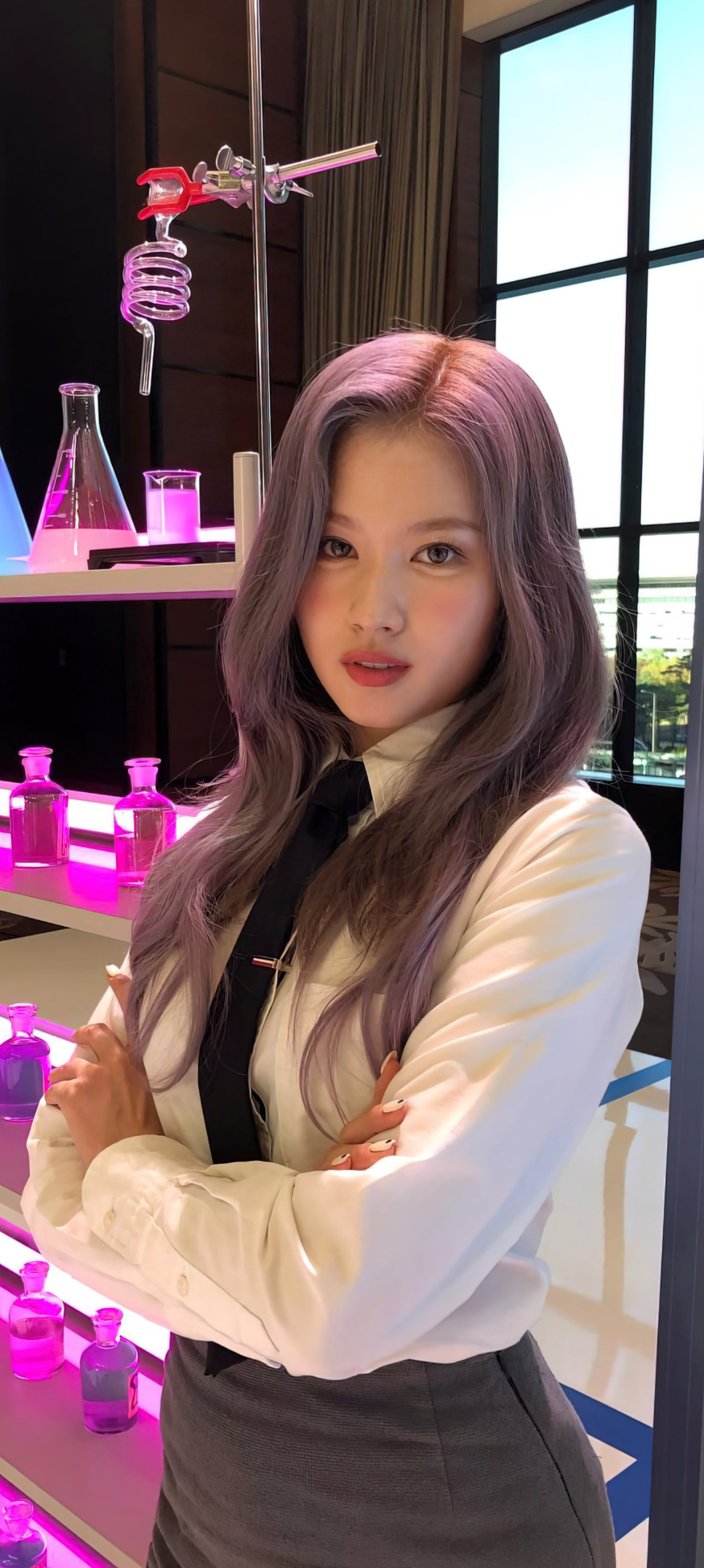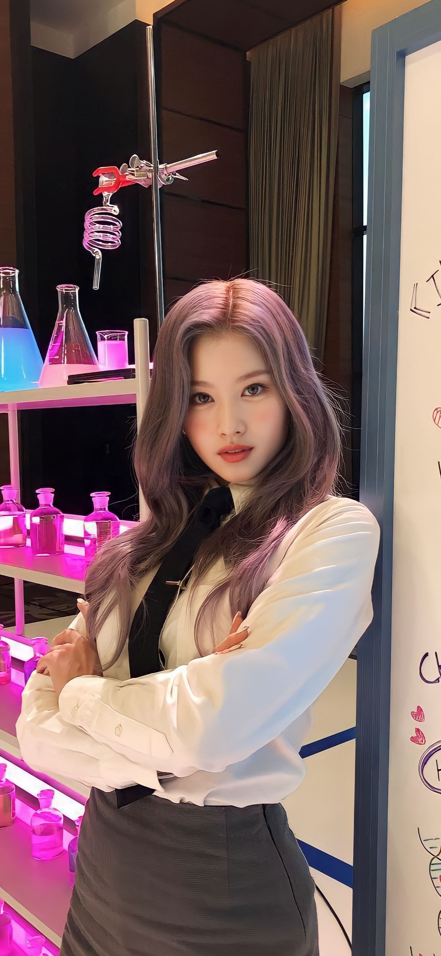 플라스크와 비커로 꾸며진 실험실 배경 속에서 사나는 마치 한 편의 영화 주인공처럼 빛납니다. 흰색 셔츠와 블랙 타이, 그리고 포인트 컬러 조명이 어우러져 독특한 분위기를 완성합니다.