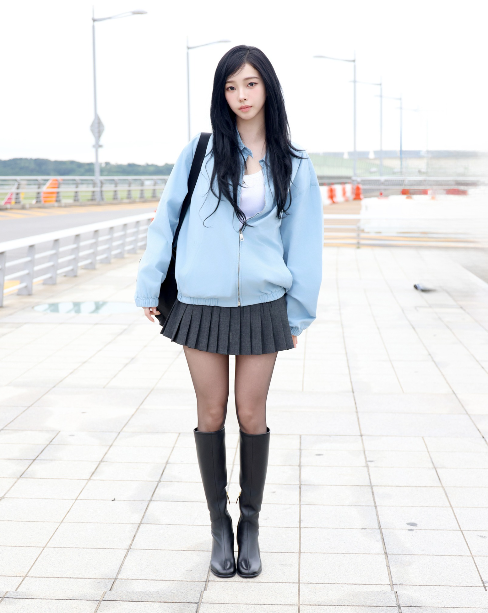 하늘색 집업 점퍼와 미니 플리츠 스커트의 조합은 캐주얼하면서도 러블리한 무드를 연출합니다. 여기에 블랙 롱부츠를 매치해 세련되면서도 시크한 느낌을 더했습니다.